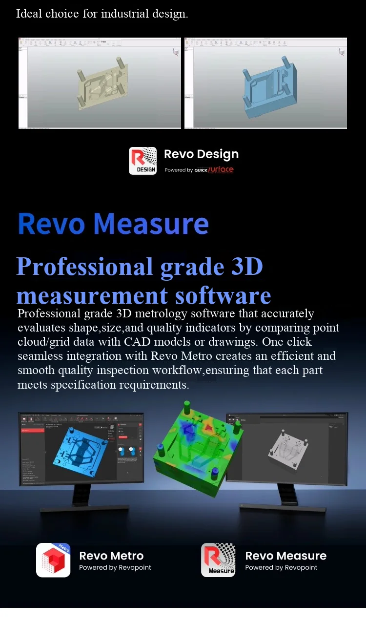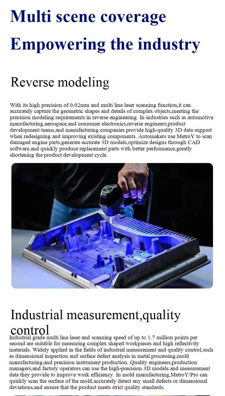 Metro Y is a series specially designed for small and medium-sized workpieces, equipped with three blue laser scanning modes, which can easily handle complex geometric structures or high difficulty scanning surfaces. MetroY Pro has added two new full field blue structured light scanning modes to expand scanning flexibility and meet higher demands. MetroY Pro's 5 scanning modes can effectively handle complex geometries and surfaces: There are four handheld scanning modes: laser cross multi line scanning, parallel multi line fine scanning, single line deep hole scanning, and full field blue structured light scanning, as well as one turntable automatic scanning mode.