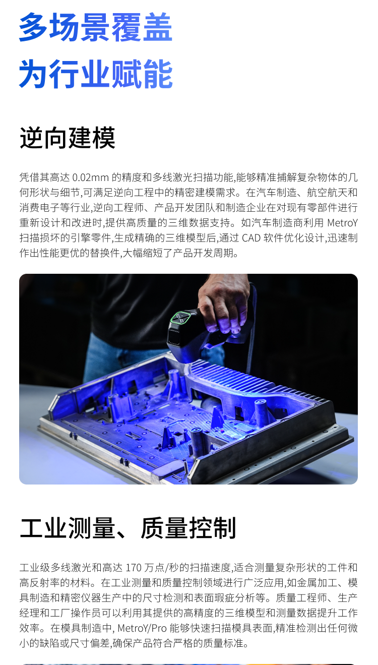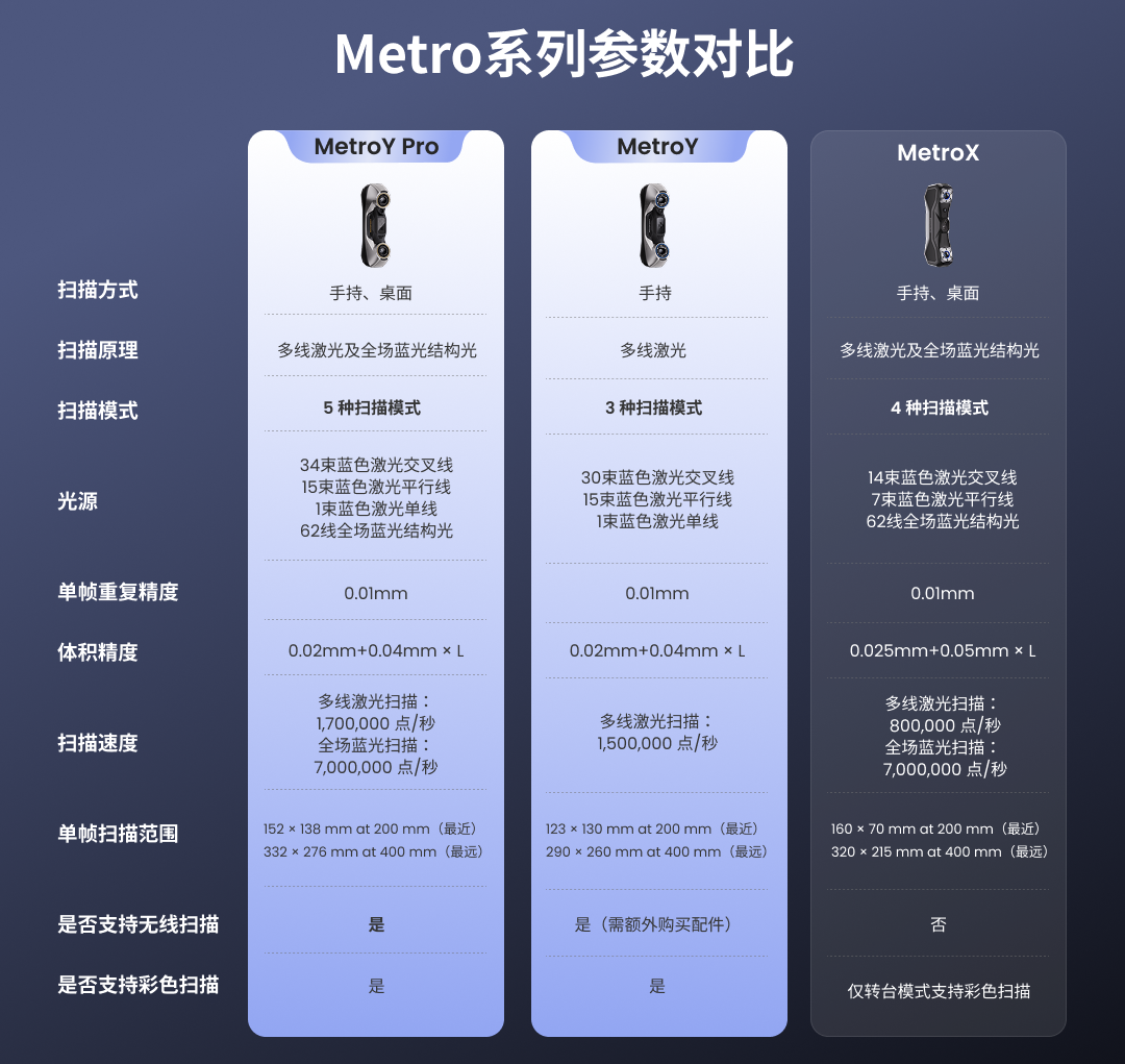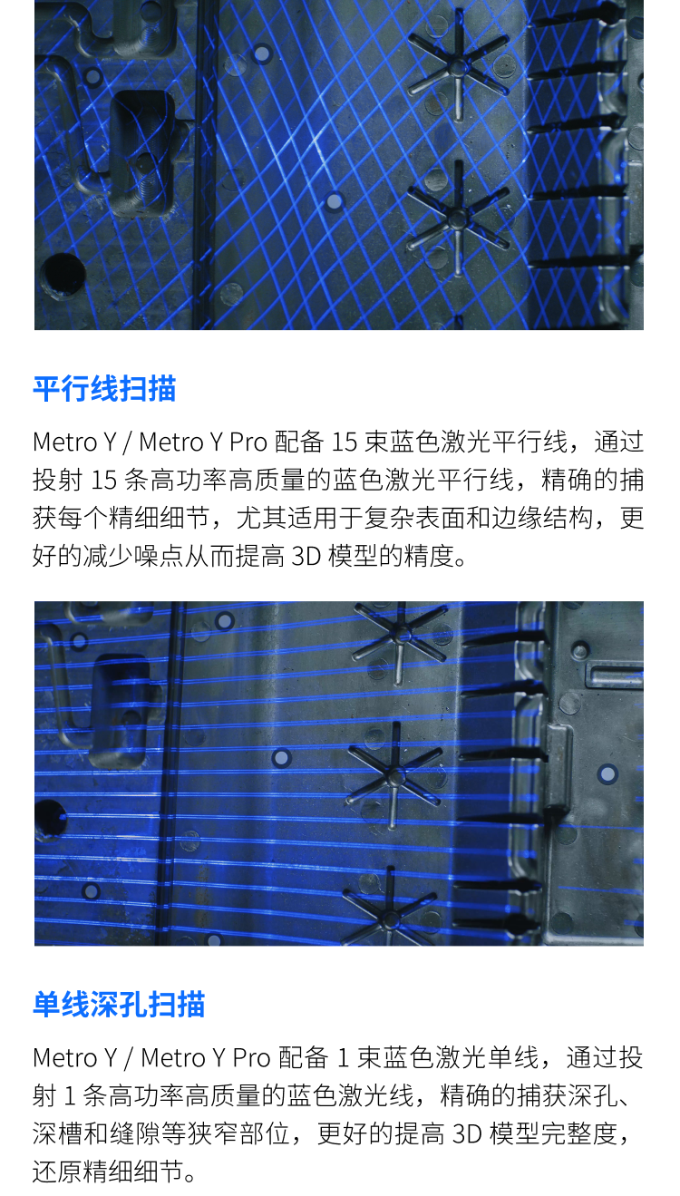Metro Y无线蓝色激光3D扫描仪, 高速模式-高达34条交叉激光线;精细模式-15条平行激光线;深孔模式-单线强化扫描。
