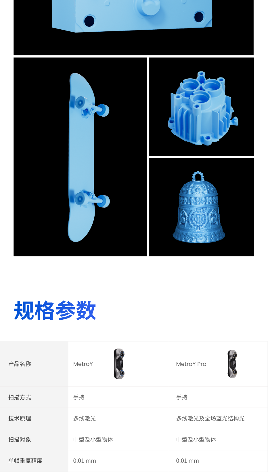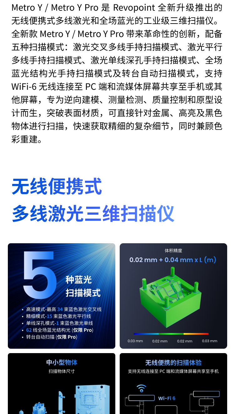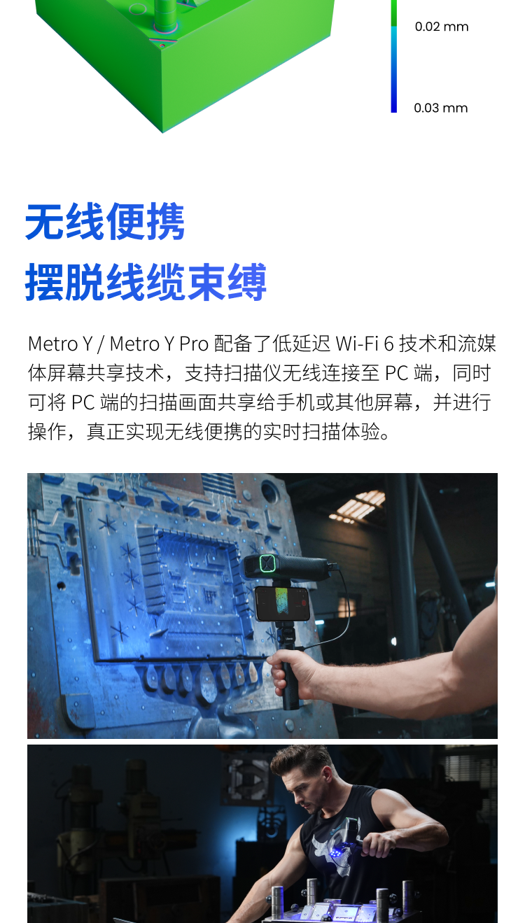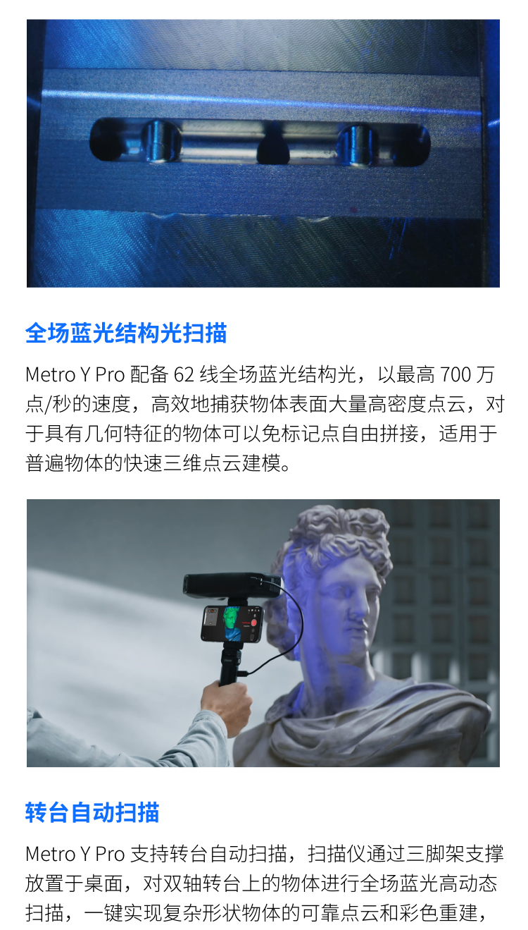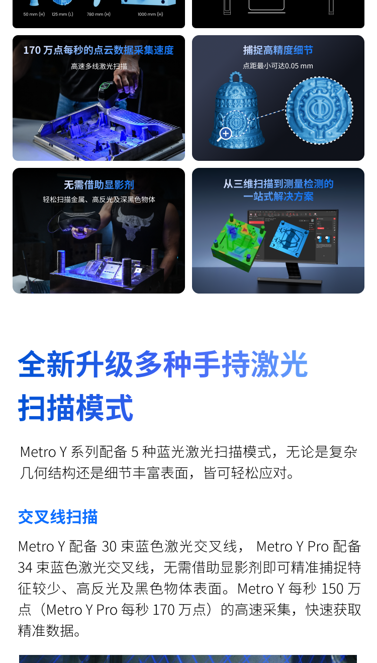 Metro Y专为中小型工件打造系列配备三种蓝色激光扫描模式,无论是复杂几何结构还是高难度扫描表面,皆可轻松应对。MetroY Pro 新增两种全场蓝光结构光扫描模式,拓展扫描灵活性,满足更高需求。MetroY Pro的 5 种扫描模式可有效处理复杂几何形状和表面: 激光交叉多线扫描、平行多线精细扫描、单线深孔扫描及全场蓝光结构光四种手持扫描模式和一种转台自动扫描模式。