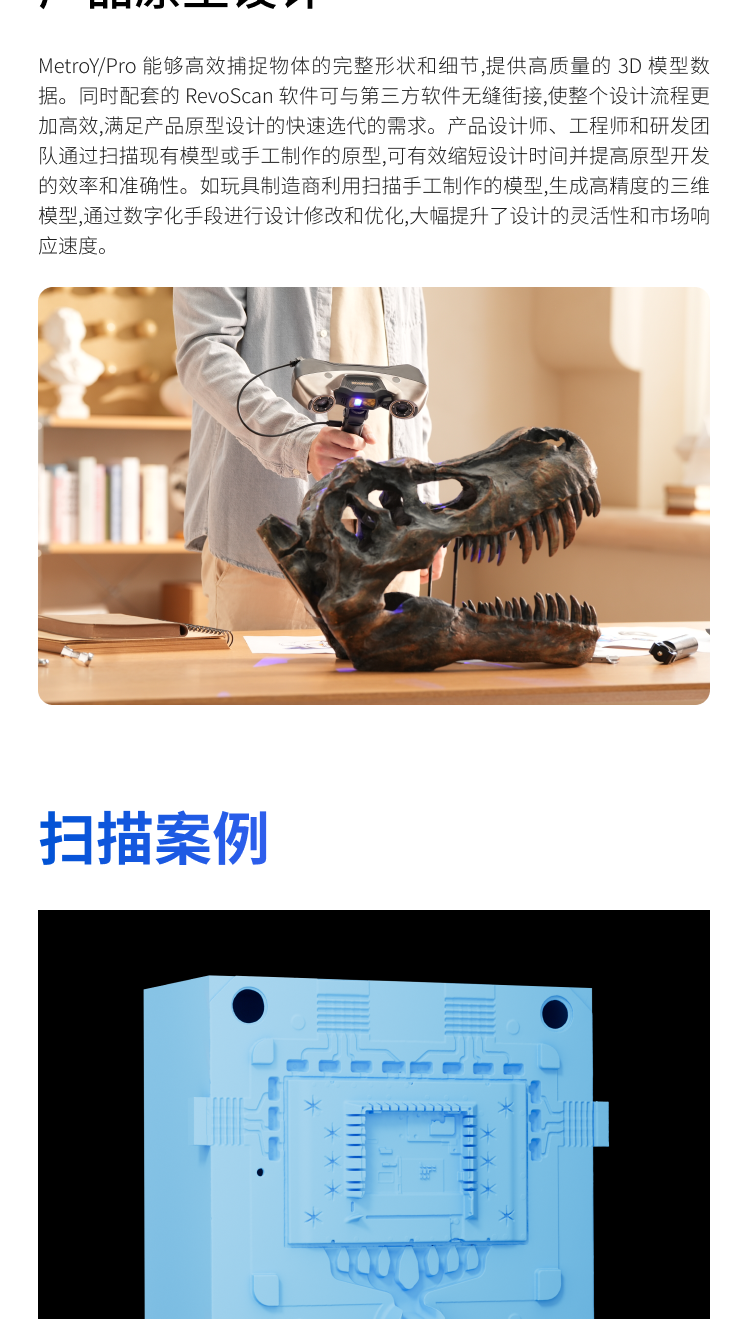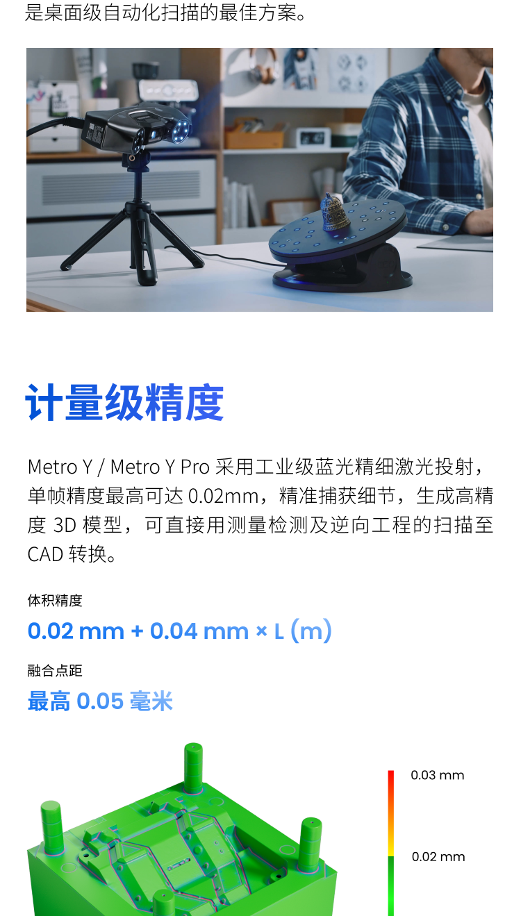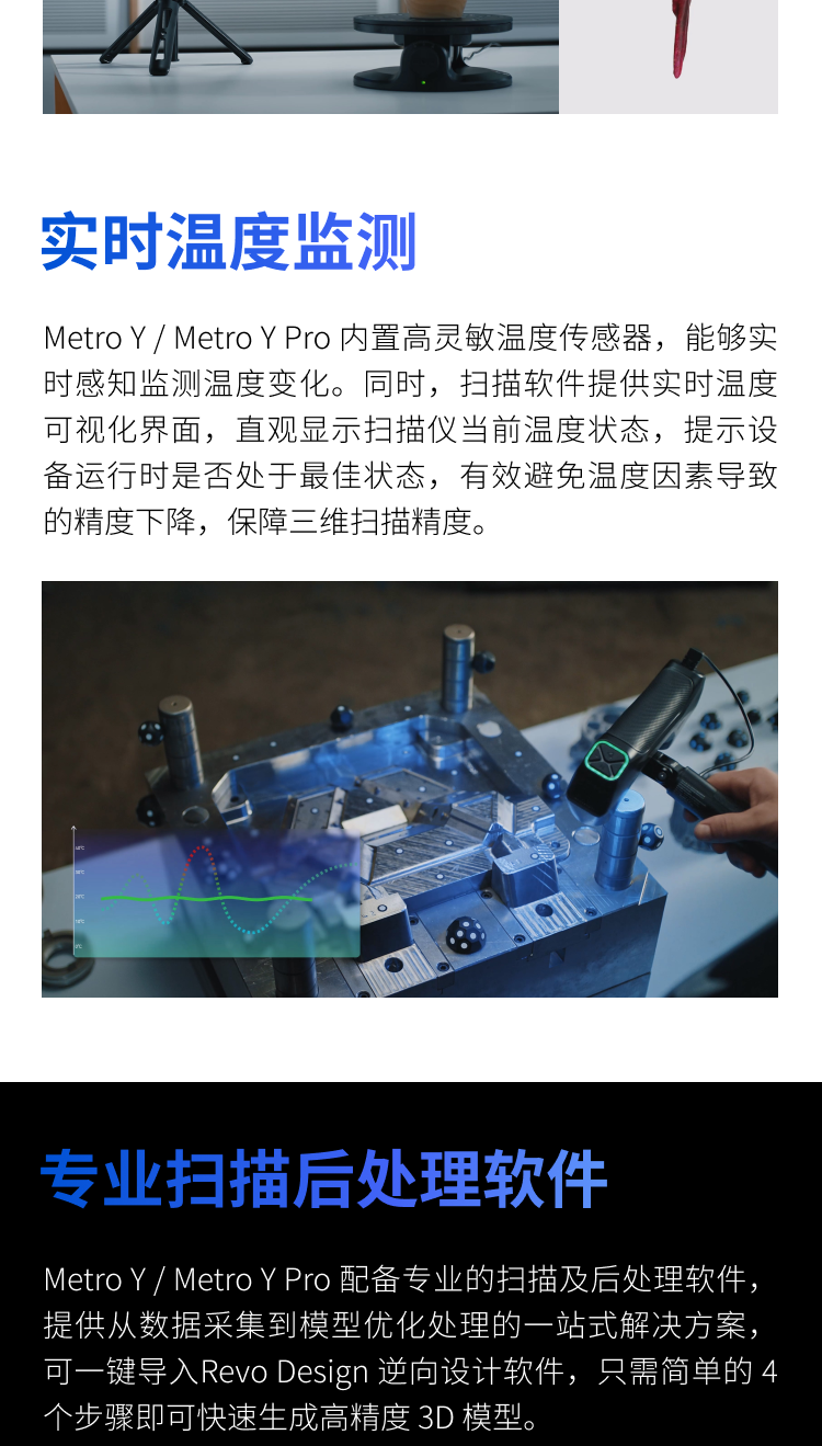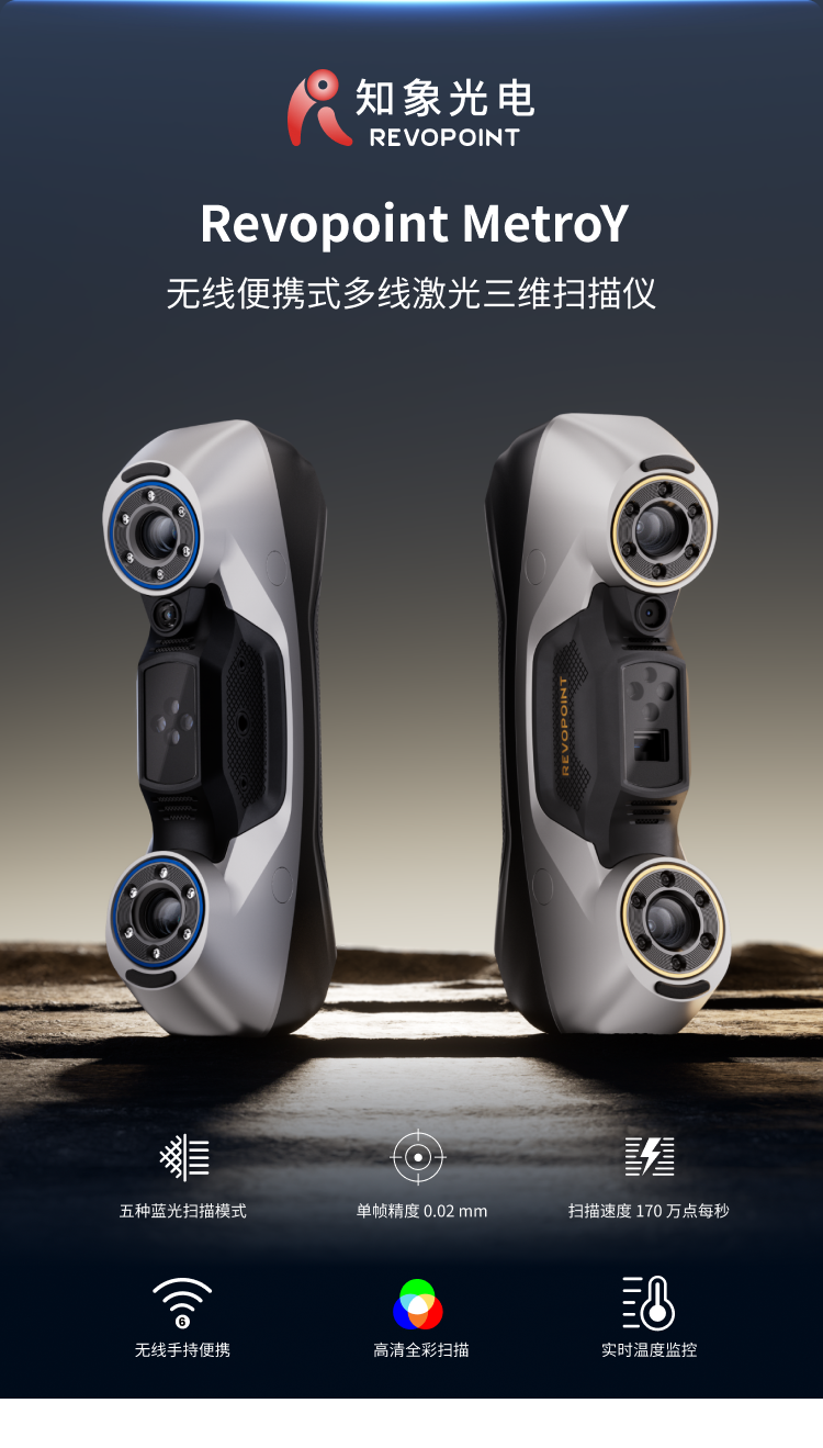 Metro Y专为中小型工件打造系列配备三种蓝色激光扫描模式,无论是复杂几何结构还是高难度扫描表面,皆可轻松应对。MetroY Pro 新增两种全场蓝光结构光扫描模式,拓展扫描灵活性,满足更高需求。MetroY Pro的 5 种扫描模式可有效处理复杂几何形状和表面: 激光交叉多线扫描、平行多线精细扫描、单线深孔扫描及全场蓝光结构光四种手持扫描模式和一种转台自动扫描模式。