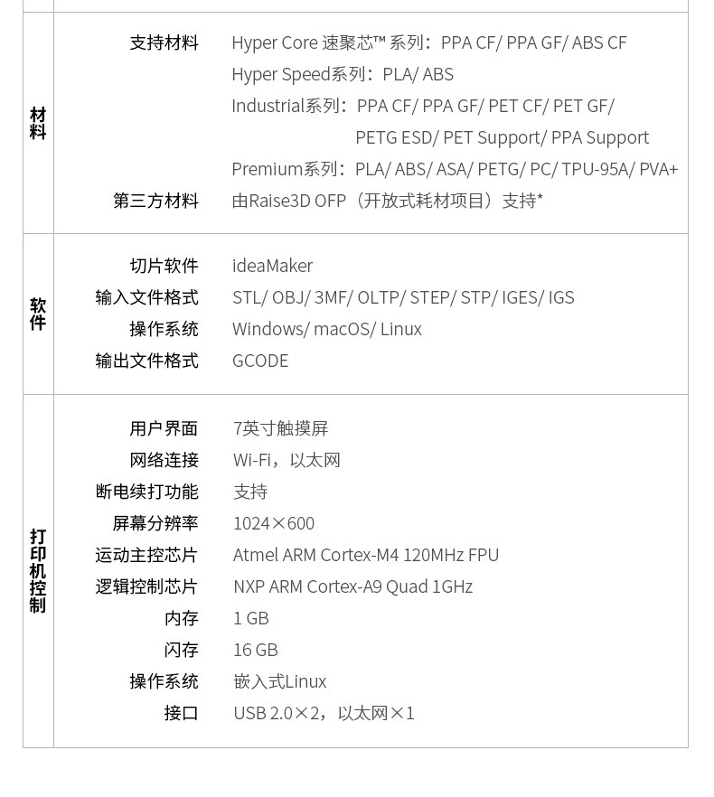 Raise3D For3 Plus HS 3D打印机升级打印平台功能,提高打印品质与体验新增自动调平功能,保证打印稳定性。柔性底板,便于取下打印模型。加粗Z轴光轴,强度增加75%,性能更稳定。独立模块化机头,可拆卸热端双挤出结构,适应多种耗材,减少堵头等状况。热端以及喉管散热风扇采用快拆设计,无工具轻松拆除。挤出机及前盖应用了模块化可拆卸设计,精准定位堵料等问题,快速拆卸,方便维修和替换。双喷头设计,更高打印效可同时打印不同材质、颜色的物件。喷嘴可单边运作,互不干扰,打印过程更稳定。左右喷嘴快速切换,不受材料及温度限制。Raise3D Pro3系列引领版:支持Hyper FFF™高速打印,实现高精度打印质量的同时,可提高超过300%的生产力。EVE智能助手EVE智能助手是Raise3D首个智能应用技术系列,将为您提供常见打印问题的解决方式。提供中文支持。帮助用户快速找到问题,减少维修时间成本及沟通成本,实现高效维修。定期提示维护功能,引导用户按时进行维护。全新Air Flow Manager系统可有效使整个腔体温度冷热循环,提升腔体的散热效率。散热性能更强。
