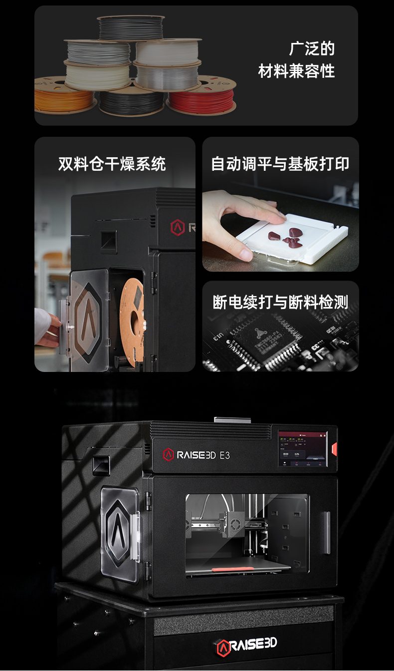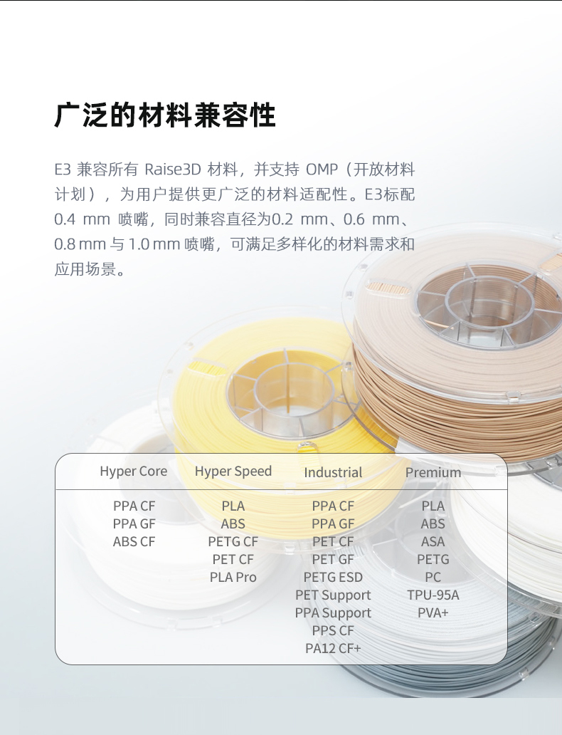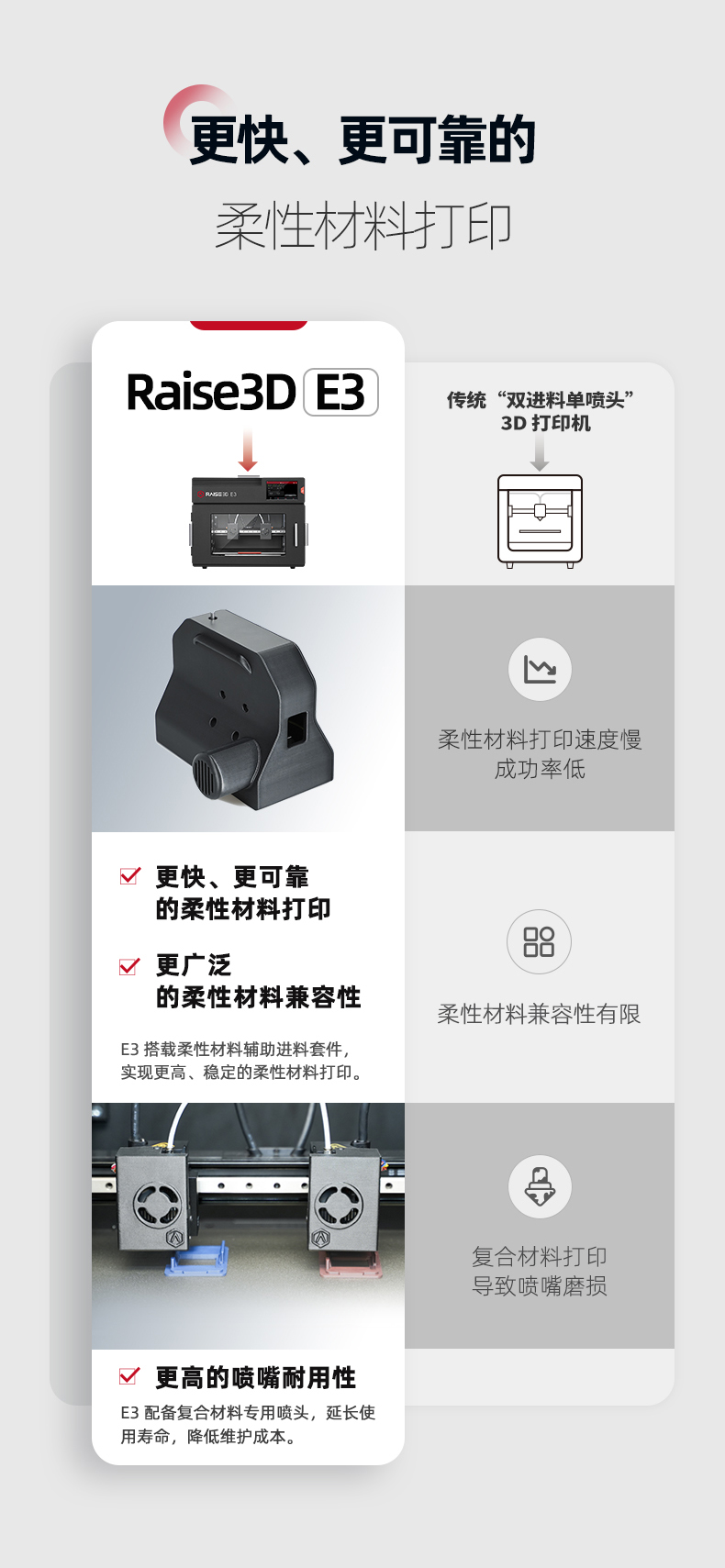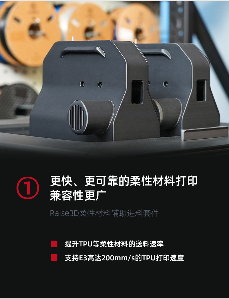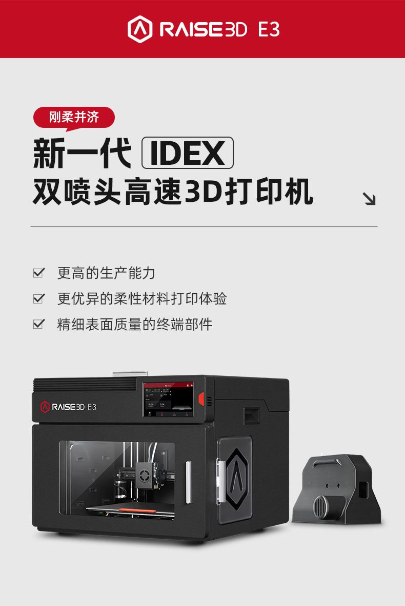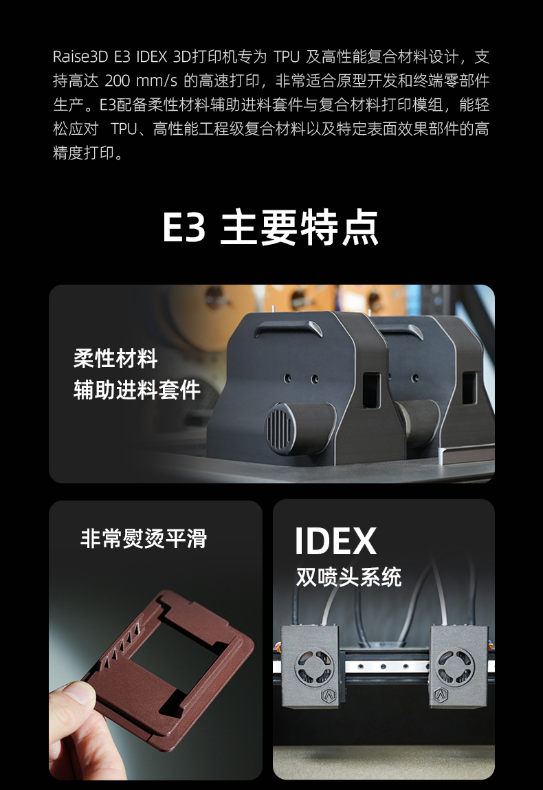 Raise3D E3 Raise3D E3 IDEX 3D打印机专为 TPU 及高性能复合材料设计,支持高达 200 mm/s 的高速打印,非常适合原型开发和终端零部件生产。E3配备柔性材料辅助进料套件与复合材料打印模组,能轻松应对 TPU、高性能工 程级复合材料以及特殊表面效果部件的高精度打印,满足多样化制造需求。