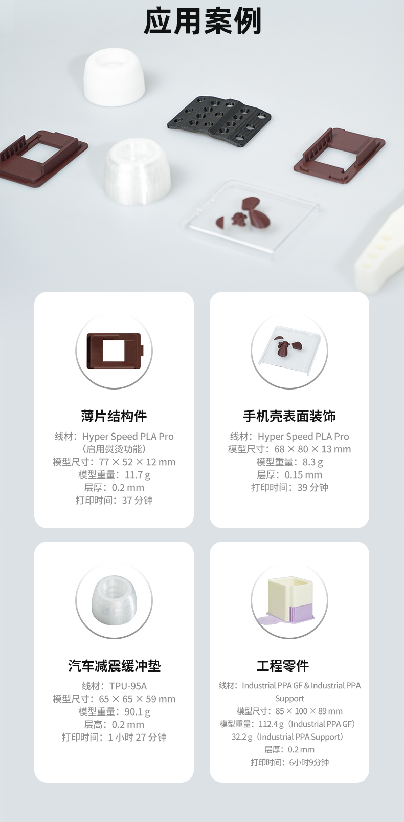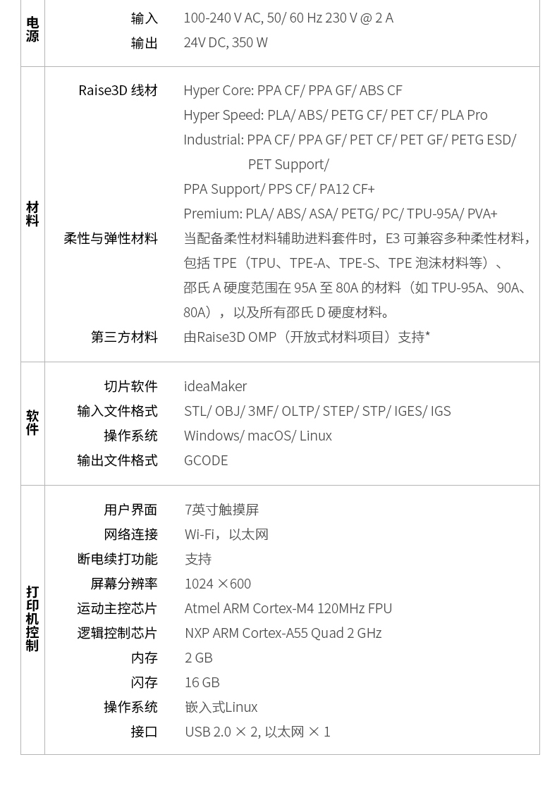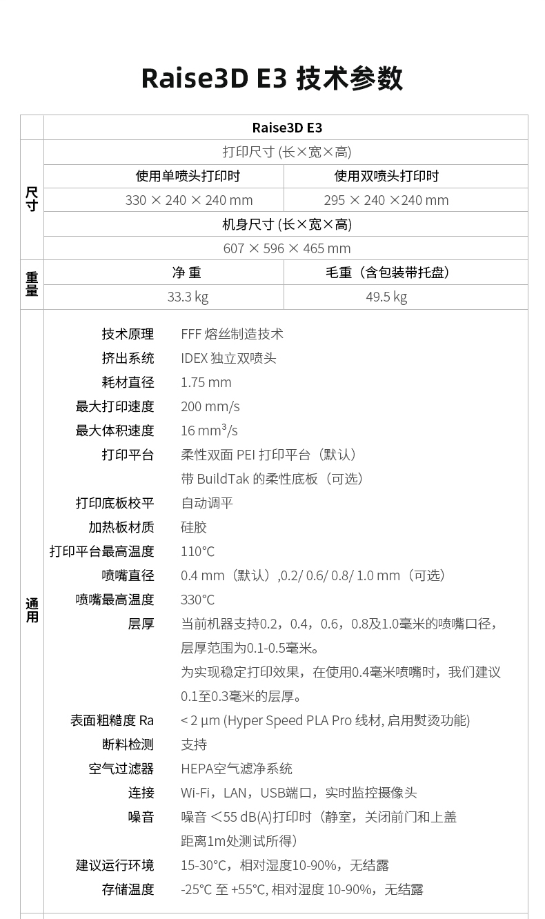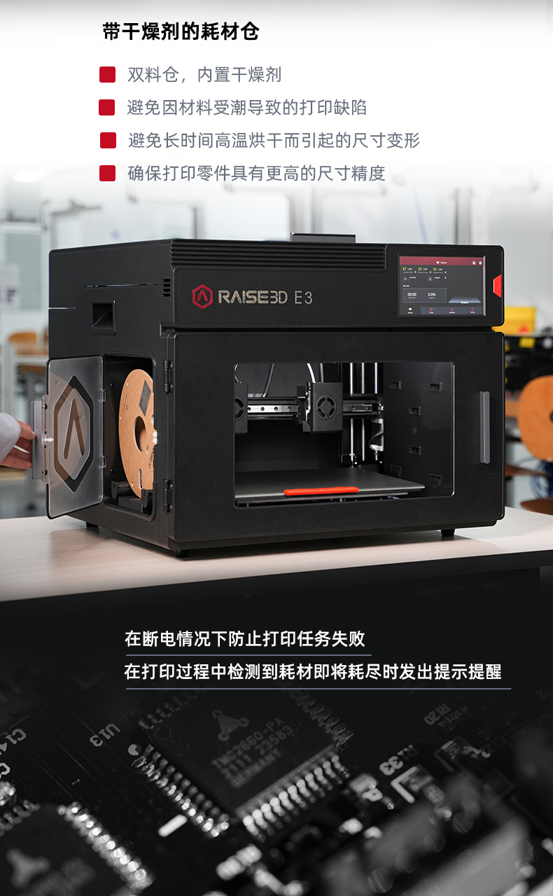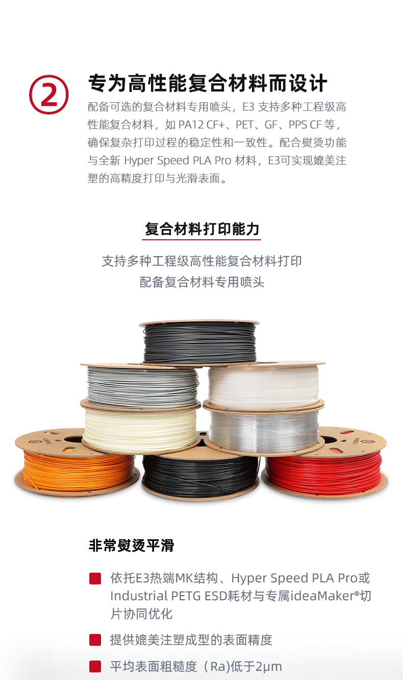 Raise3D E3 Raise3D E3 IDEX 3D打印机专为 TPU 及高性能复合材料设计,支持高达 200 mm/s 的高速打印,非常适合原型开发和终端零部件生产。E3配备柔性材料辅助进料套件与复合材料打印模组,能轻松应对 TPU、高性能工 程级复合材料以及特殊表面效果部件的高精度打印,满足多样化制造需求。