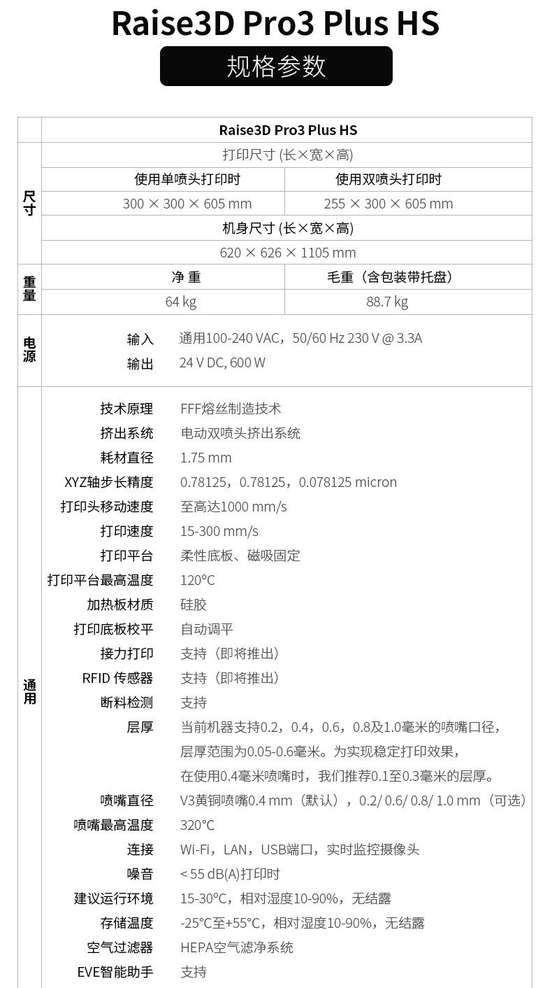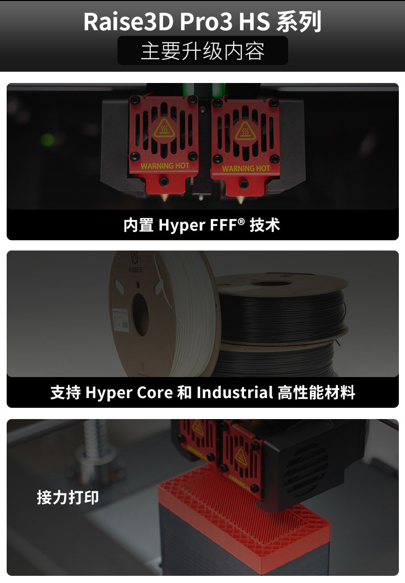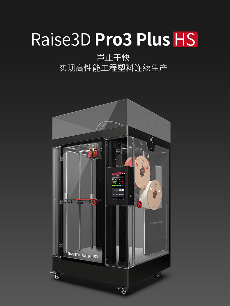 Raise3D For3 Plus HS 3D打印机升级打印平台功能,提高打印品质与体验新增自动调平功能,保证打印稳定性。柔性底板,便于取下打印模型。加粗Z轴光轴,强度增加75%,性能更稳定。独立模块化机头,可拆卸热端双挤出结构,适应多种耗材,减少堵头等状况。热端以及喉管散热风扇采用快拆设计,无工具轻松拆除。挤出机及前盖应用了模块化可拆卸设计,精准定位堵料等问题,快速拆卸,方便维修和替换。双喷头设计,更高打印效可同时打印不同材质、颜色的物件。喷嘴可单边运作,互不干扰,打印过程更稳定。左右喷嘴快速切换,不受材料及温度限制。Raise3D Pro3系列引领版:支持Hyper FFF™高速打印,实现高精度打印质量的同时,可提高超过300%的生产力。EVE智能助手EVE智能助手是Raise3D首个智能应用技术系列,将为您提供常见打印问题的解决方式。提供中文支持。帮助用户快速找到问题,减少维修时间成本及沟通成本,实现高效维修。定期提示维护功能,引导用户按时进行维护。全新Air Flow Manager系统可有效使整个腔体温度冷热循环,提升腔体的散热效率。散热性能更强。