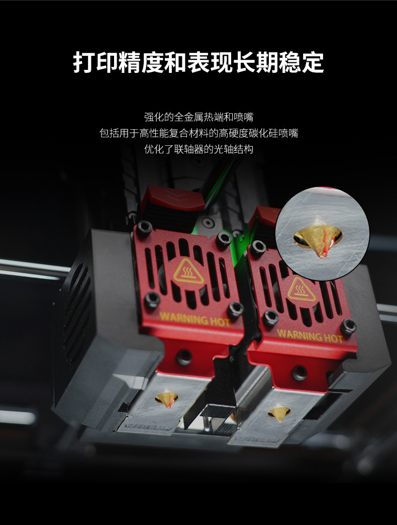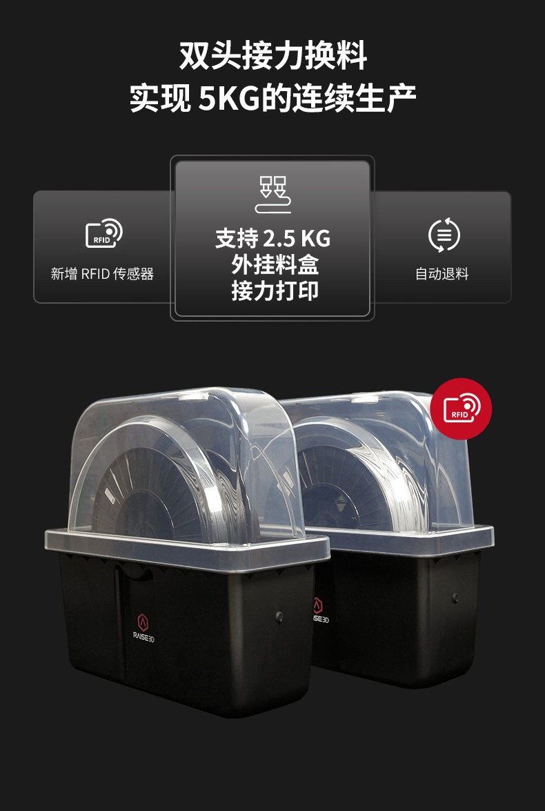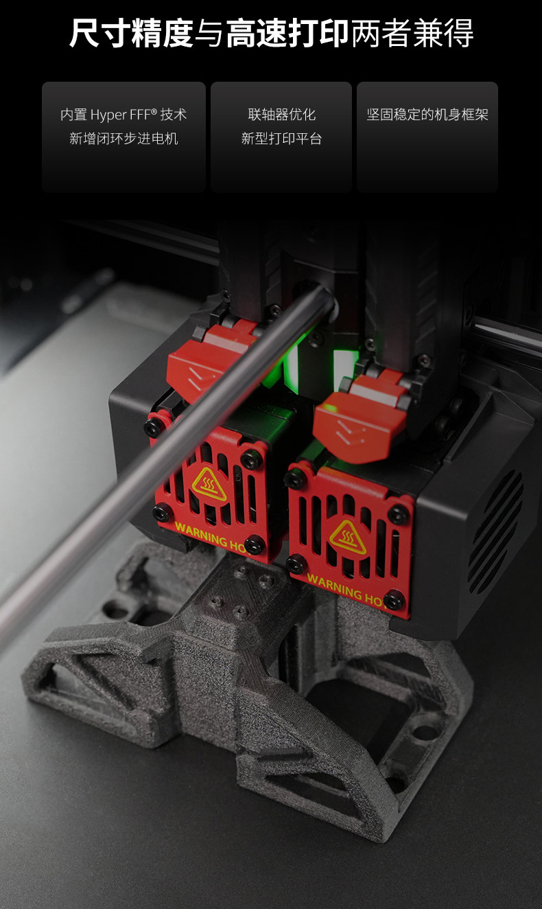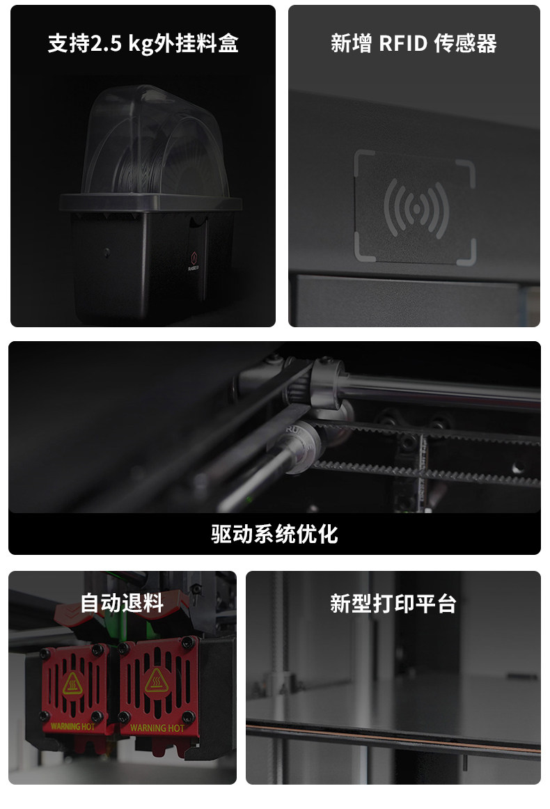 Raise3D For3 Plus HS 3D打印机升级打印平台功能,提高打印品质与体验新增自动调平功能,保证打印稳定性。柔性底板,便于取下打印模型。加粗Z轴光轴,强度增加75%,性能更稳定。独立模块化机头,可拆卸热端双挤出结构,适应多种耗材,减少堵头等状况。热端以及喉管散热风扇采用快拆设计,无工具轻松拆除。挤出机及前盖应用了模块化可拆卸设计,精准定位堵料等问题,快速拆卸,方便维修和替换。双喷头设计,更高打印效可同时打印不同材质、颜色的物件。喷嘴可单边运作,互不干扰,打印过程更稳定。左右喷嘴快速切换,不受材料及温度限制。Raise3D Pro3系列引领版:支持Hyper FFF™高速打印,实现高精度打印质量的同时,可提高超过300%的生产力。EVE智能助手EVE智能助手是Raise3D首个智能应用技术系列,将为您提供常见打印问题的解决方式。提供中文支持。帮助用户快速找到问题,减少维修时间成本及沟通成本,实现高效维修。定期提示维护功能,引导用户按时进行维护。全新Air Flow Manager系统可有效使整个腔体温度冷热循环,提升腔体的散热效率。散热性能更强。